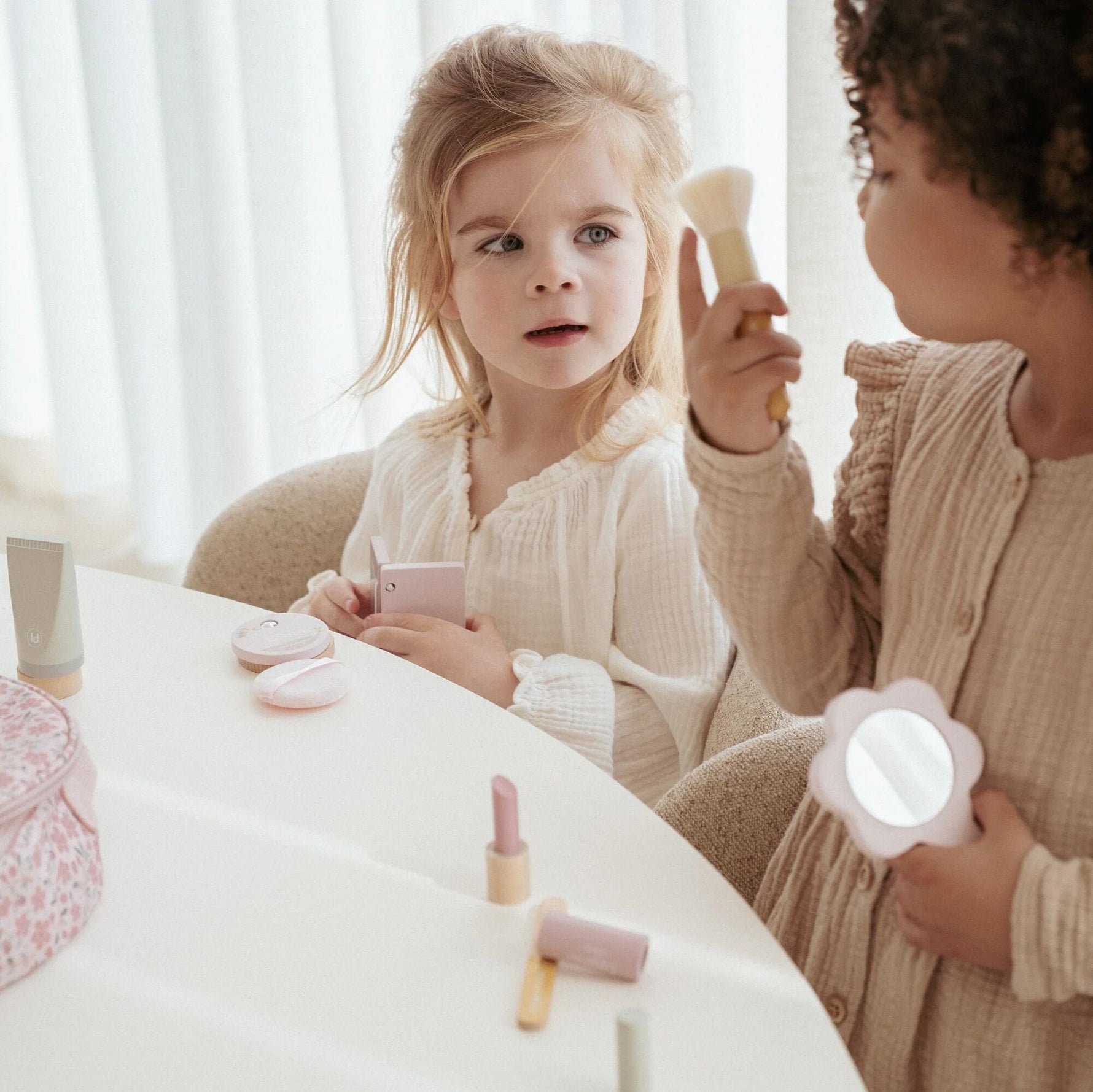 Unit price / perWith this beautiful wooden makeup set, your little one can have endless fun! The soft floral bag is filled with the most wonderful beauty products, such as a hand mirror, perfume bottle, lipstick, nail polish, and much more. The set is perfect for role-playing and imaginative play – without any mess! Now your little makeup artist can be just as stylish as mommy.