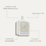 Our 650 ml bottles are made from 100% Post-Consumer Recycled (PCR) HDPE plastic and are fully kerbside recyclable. The bottle label is made from PP with 30% post-industrial waste and can be left on during recycling. The cap is made from PP with a PE liner and is also recyclable when left attached.