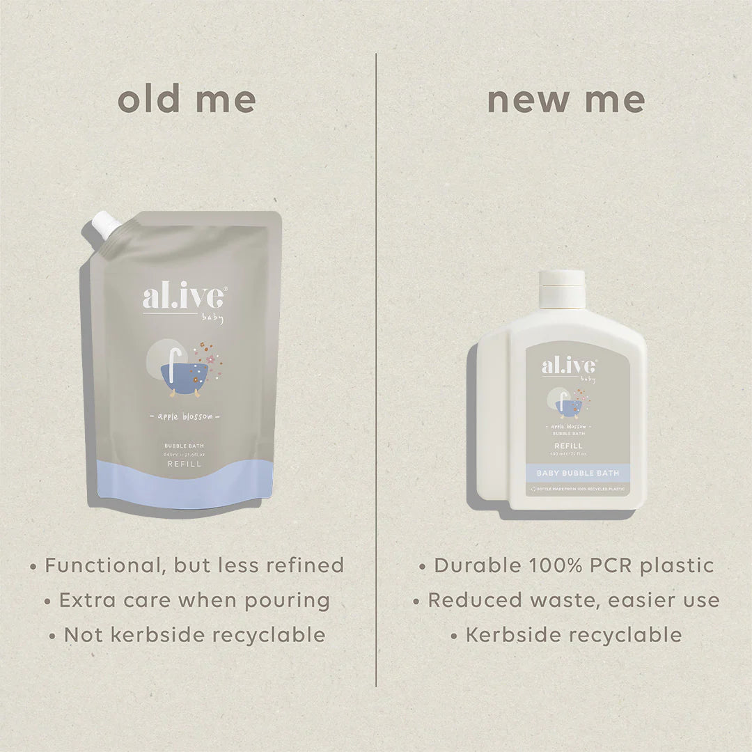 Each refill is designed to refill the 320ml al.ive body Baby Wash bottle twice, with a little to spare. Featuring a controlled-flow spout for mess-free pouring, a compact shape for easy storage, and full kerbside recyclability, it offers a practical and premium solution that extends the life of the product you already love.