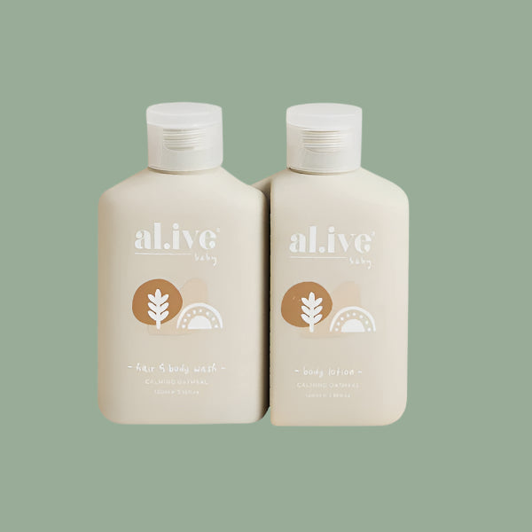 The al.ive baby Hair and Body Duo contains a Baby Hair and Body Wash and Body Lotion, both housed in a convenient non-slip tray with easy-to-pump lids. The formula is vegan, cruelty-free, and palm oil-free, and contains naturally derived ingredients that are gentle on the skin.