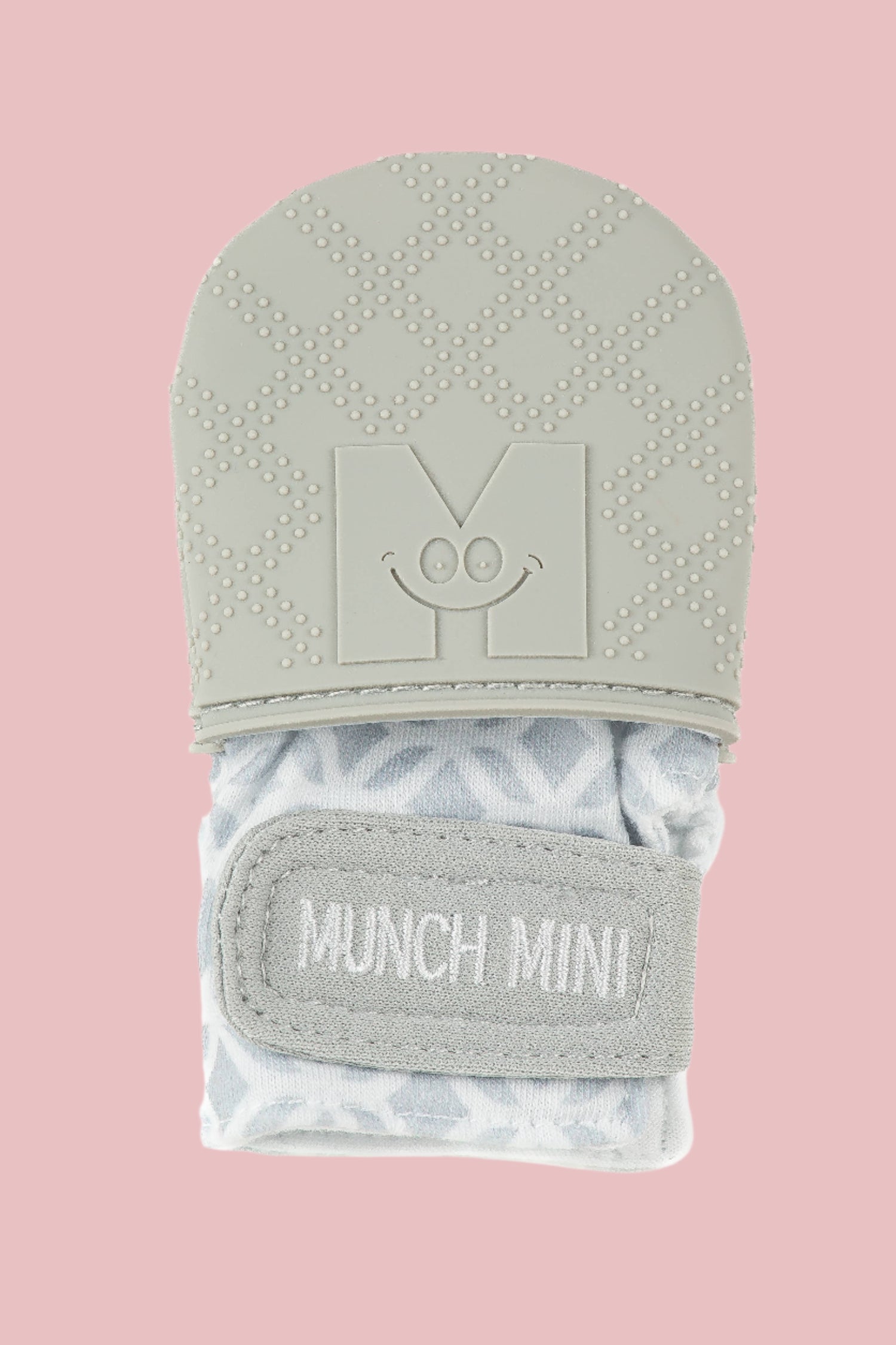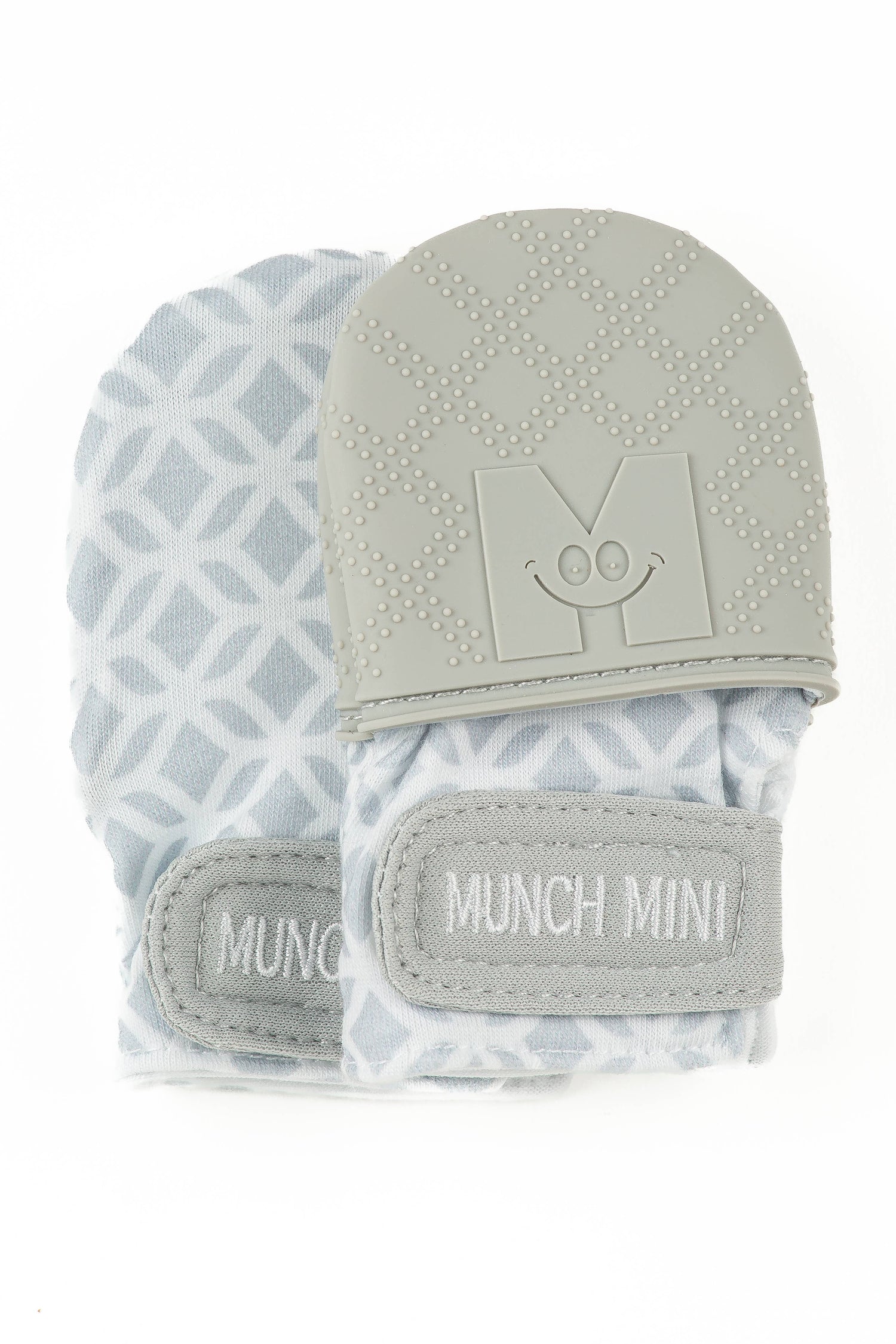 The combined traditional anti-scratch mittens and trademark Munch Mitt silicone cap technology make for the perfect newborn anti scratch + chew mitts.