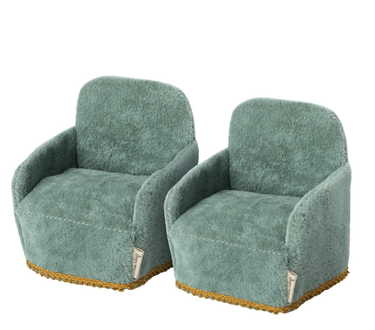单价 每This lovely pair of Maileg Mouse Chairs features a soft fluffy green finish, with gold brocade edging around the base for a bit of royal flair. You will receive two armchairs, which will come flat-packed but are very easy to fold and assemble.