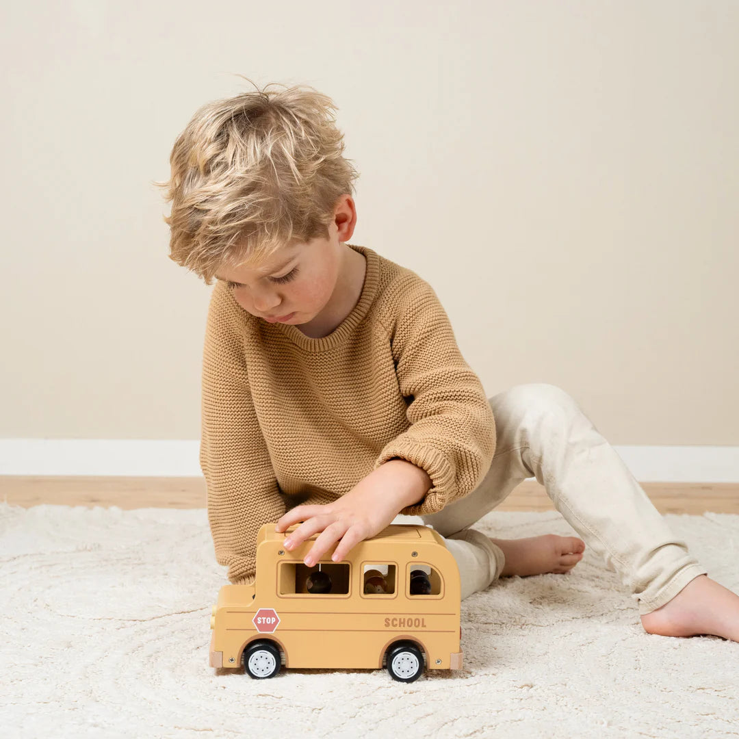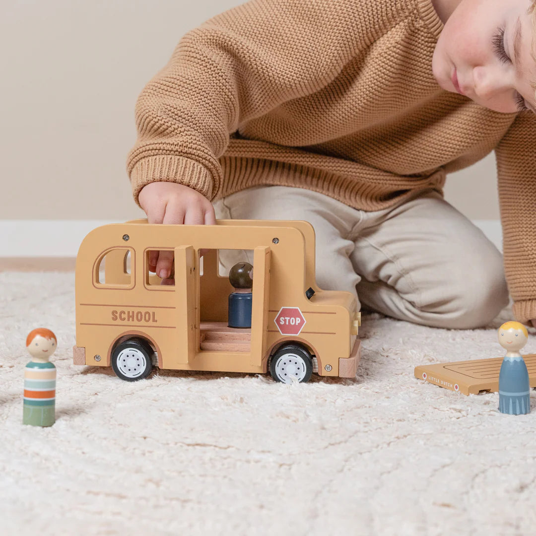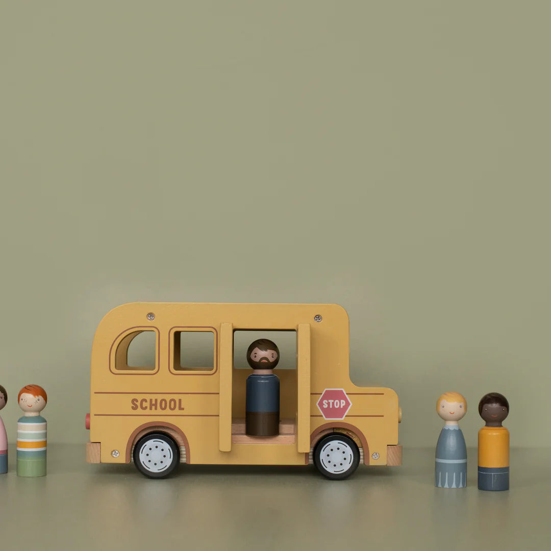 单价 每Hop on board for an exciting adventure with this wooden school bus. Are all the children seated? Once the driver starts the engine, the journey begins. Whether exploring a make-believe city or picking up imaginary passengers, this bus is ready to go. With smooth-rolling wheels, little ones can easily drive across the floor, stopping at every corner to pick up friends. The door and roof open for interactive play, and the figures are compatible with the dollhouse and other playsets like the airplane and car with caravan. A perfect toy to inspire storytelling and creative adventures.