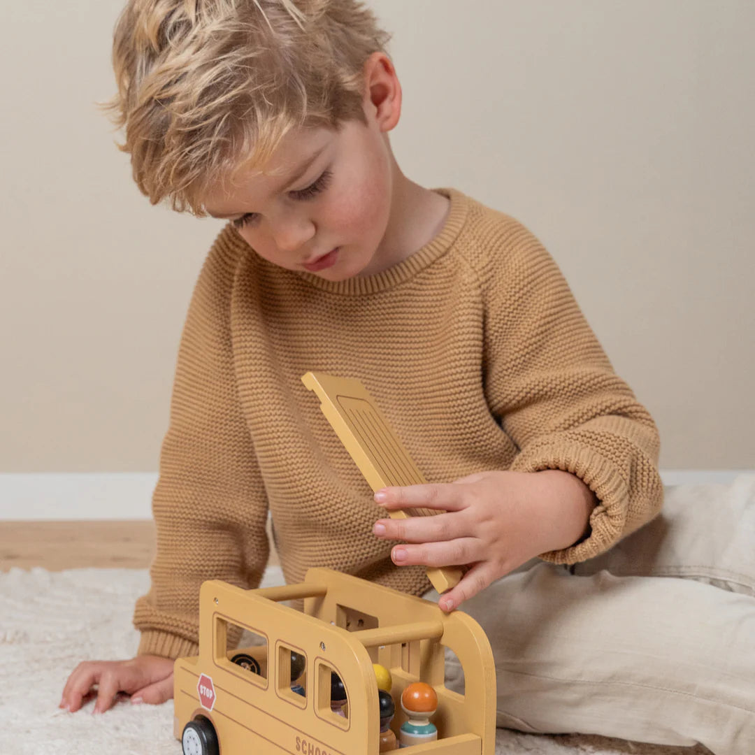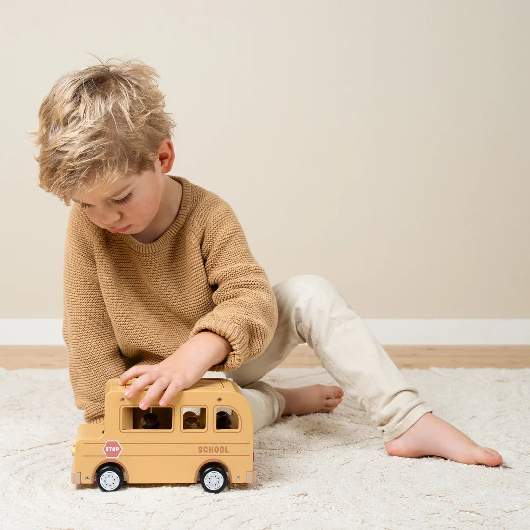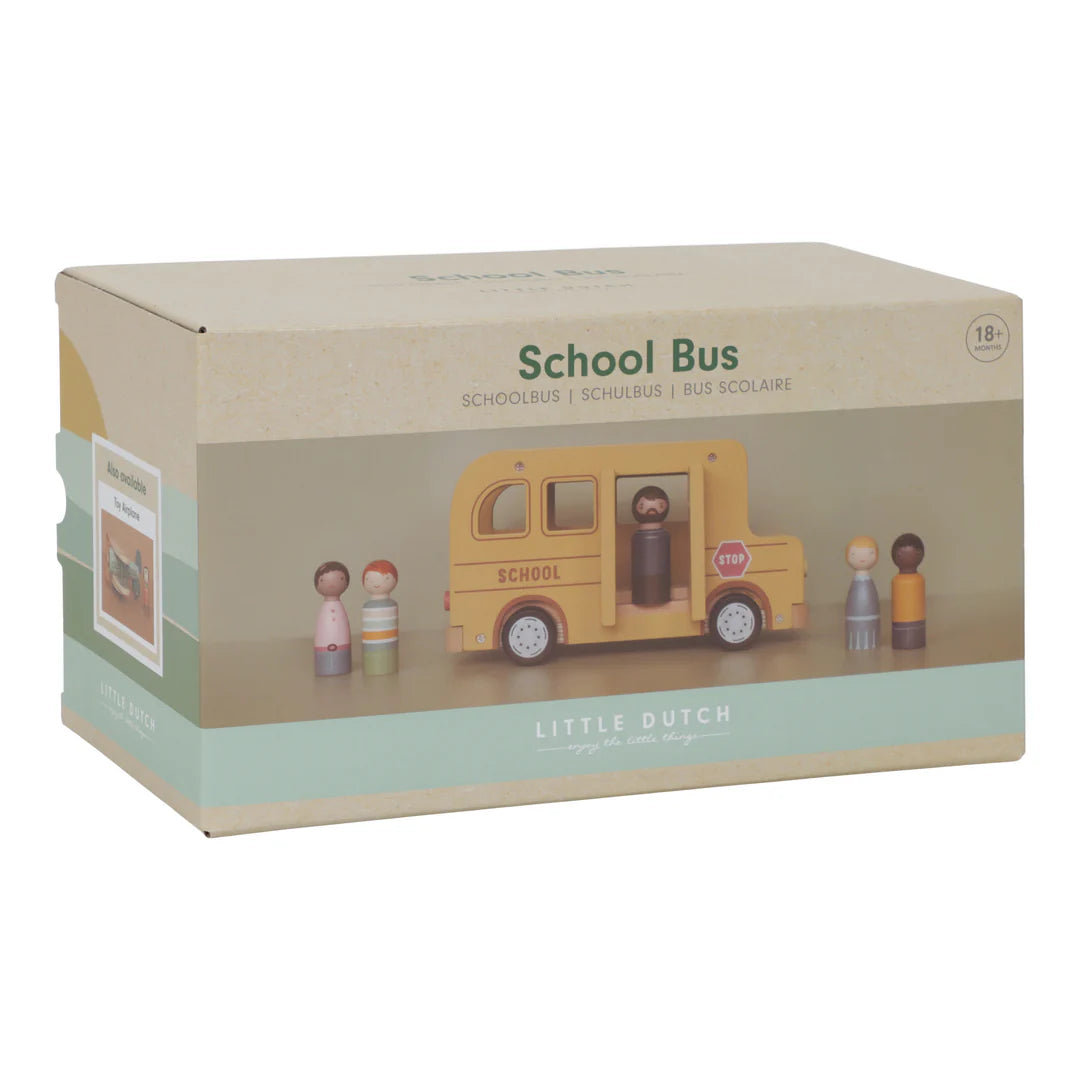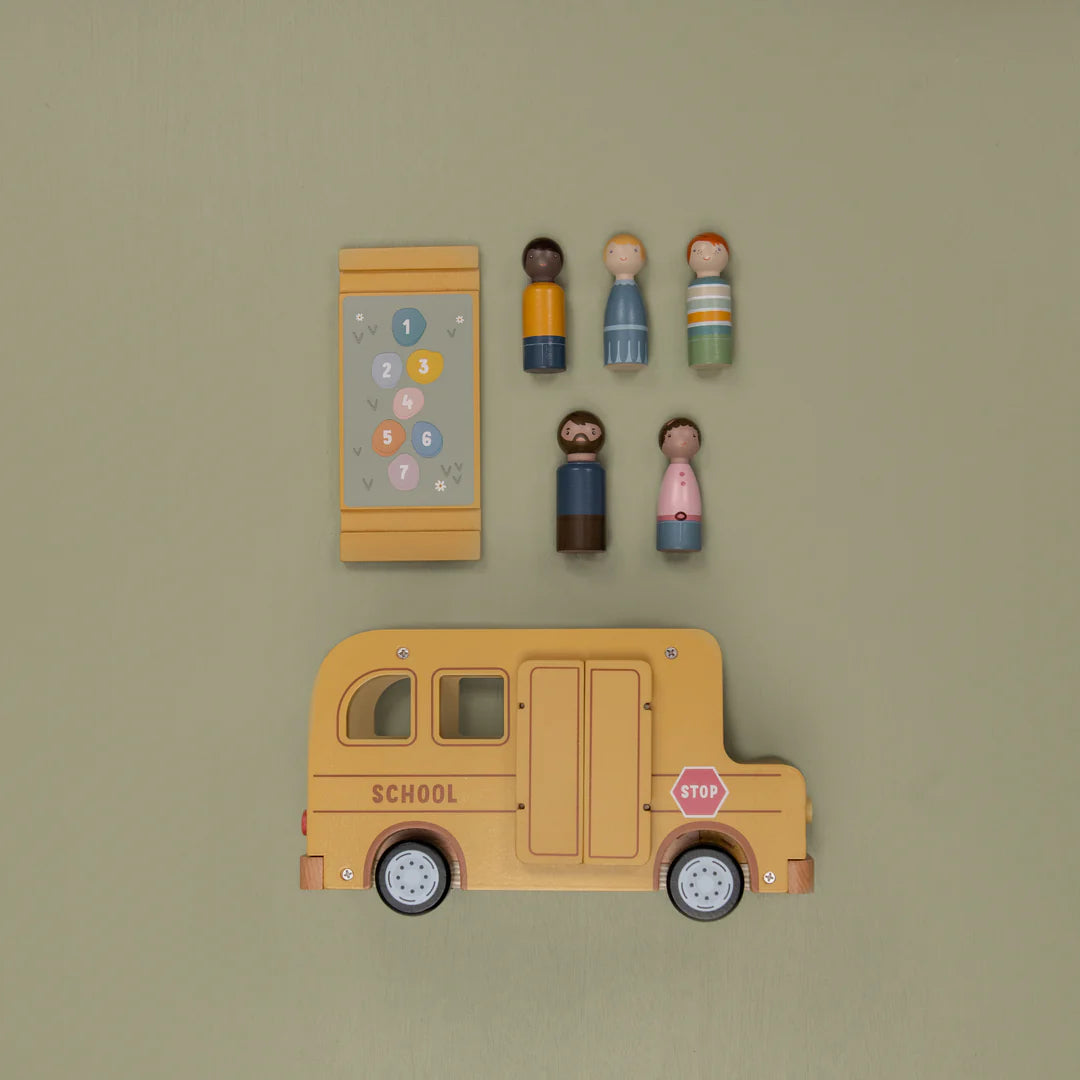 单价 每Hop on board for an exciting adventure with this wooden school bus. Are all the children seated? Once the driver starts the engine, the journey begins. Whether exploring a make-believe city or picking up imaginary passengers, this bus is ready to go. With smooth-rolling wheels, little ones can easily drive across the floor, stopping at every corner to pick up friends. The door and roof open for interactive play, and the figures are compatible with the dollhouse and other playsets like the airplane and car with caravan. A perfect toy to inspire storytelling and creative adventures.