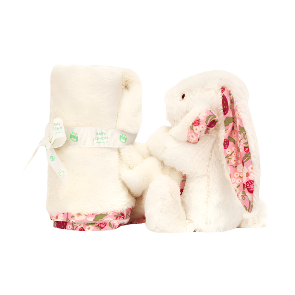 单价 每A perfect gift for newborns, the Blossom Cream Bunny ‘Berry’ Soother is our most loved Bashful Bunny in a soft cream fur, with strawberry patterned ears in an original Jellycat design, a pink suedette nose and stitched eye detail holding a square shaped soother with strawberry edging, un-stuffed and irresistibly soft to touch. Made from recycled fibres and neatly rolled up and presented with a Baby Jellycat grosgrain ribbon.