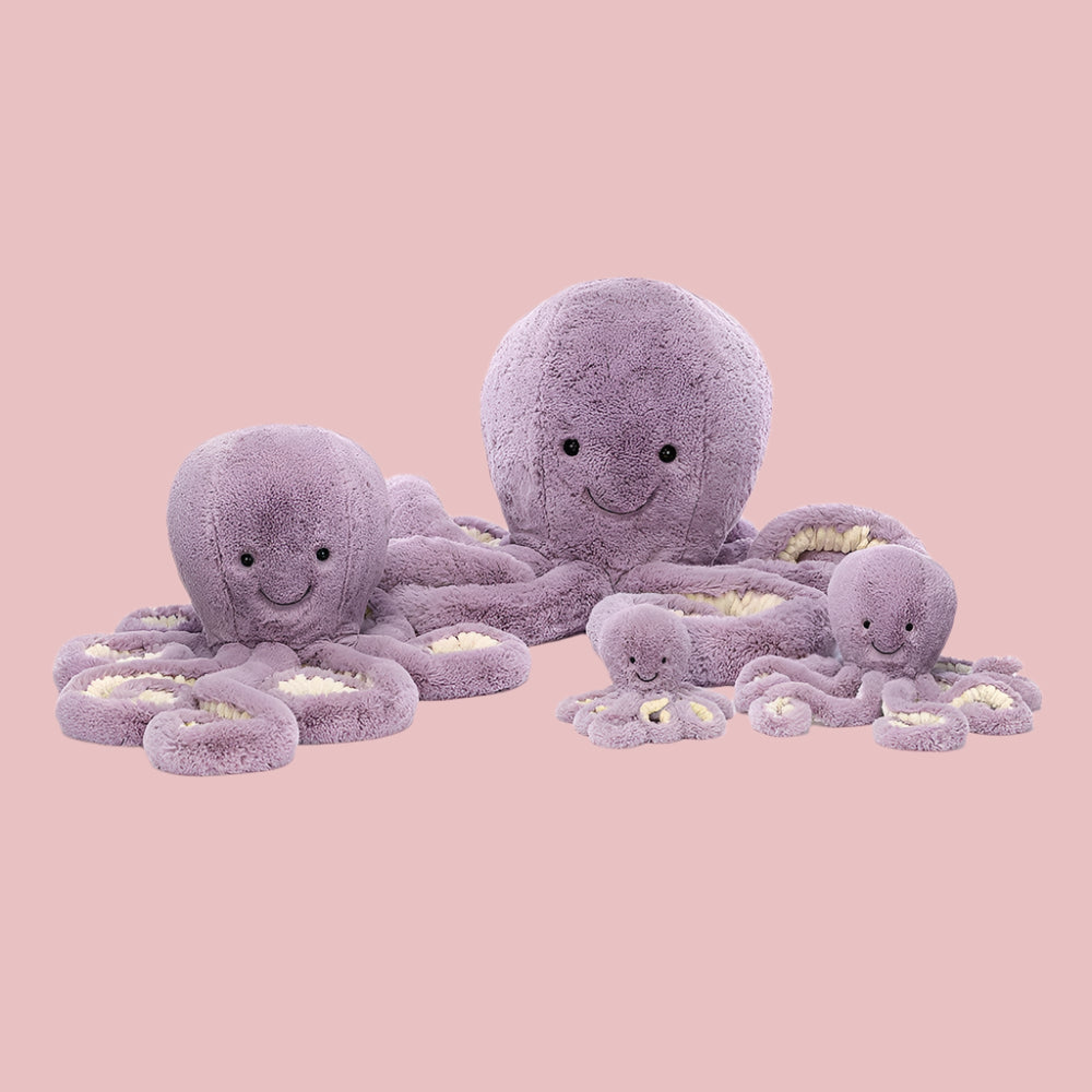 单价 每"With eight soft jumbo corduroy tentacles and a wide embroidered smile Maya Octopus is the perfect companion for giving the biggest of hugs. Her sil-like fur in a dusky mauve hue adds to Maya's irresistible ocean charms."