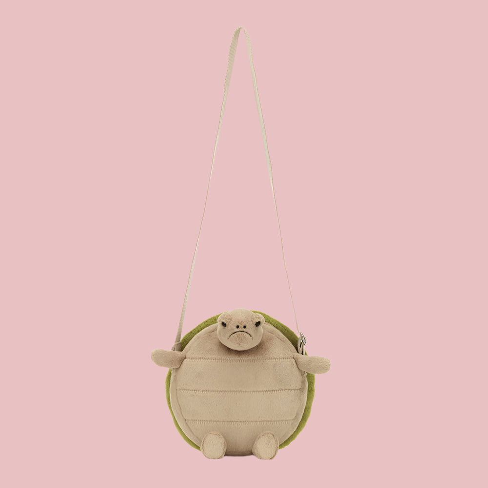 "The Timmy Turtle Bag is charmingly grumpy, with a textured beige tum and embroidered green shell. The strong webbed strap will keep Timmy safe riding on a shoulder. With a silver zipper, Jellycat tag and protective beige satin lining, this bag holds everything but grudges!"