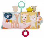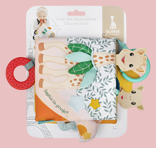 The protruding parts of the book encourage baby to turn the pages and discover different surprises: Kiwi the bird hiding behind a cloud, Sophie la girafe playing hide and seek with the leaves, the pyramid of crackling sand...