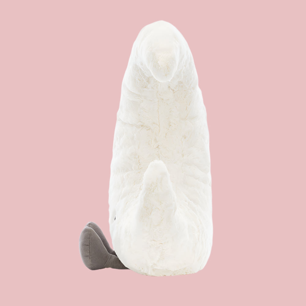 "Gorgeously textured with velvety craters, Amuseables Moon is full of fun! A midnight matey for bedtime hugs, this pearly-white pal is curvy and cuddly. With squidgy cord booties, a weighted bottom and a peaceful smile, this moon's waxing poetic! A magical crescent and a marvellous present."