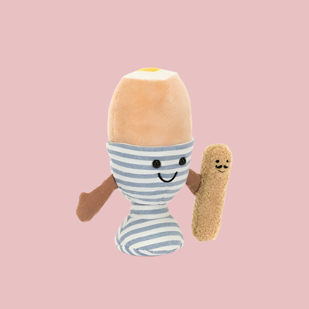 Start every day right with Amuseables Eggetha Egg & Lance Soldier. A textured soft-boiled egg sits in a blue and white striped cotton egg cup with fine cord arms and a stitched smile. Eggetha Egg holds on to perfectly toasted Lance Soldier, in golden brown textured fur with embroidered facial features and moustache.