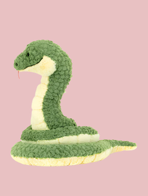"Cizi Snake is a statement-making serpent this festival season. Bright and bold in contrasting forest green and pale yellow fur, Cizi has soft textured scales, embroidered scutes detail, and a sweet, smiling face. Poised ready to strike for a cuddle, Cizi is showing off that suedette forked tongue."