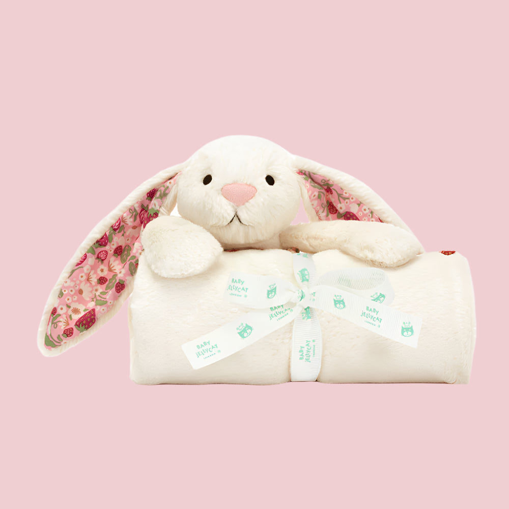 单价 每The Blossom Cream Bunny ‘Berry’ Blankie combines our most loved Bashful Bunny character’s long lop ears, pink suedette nose, embroidery eyes and soft squashy paws with a blankie made from the same cloud soft, cream coloured fur in recycled fibres, with strawberry patterned ears and edging in an original Jellycat print. Neatly rolled and tied with a Baby Jellycat grosgrain ribbon, this is an exquisite gift of endless comfort and timeless charm.
