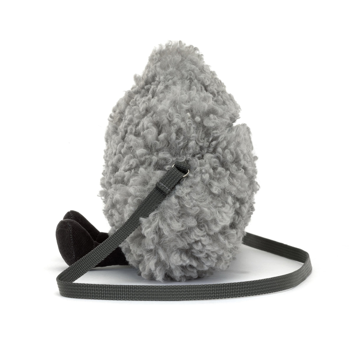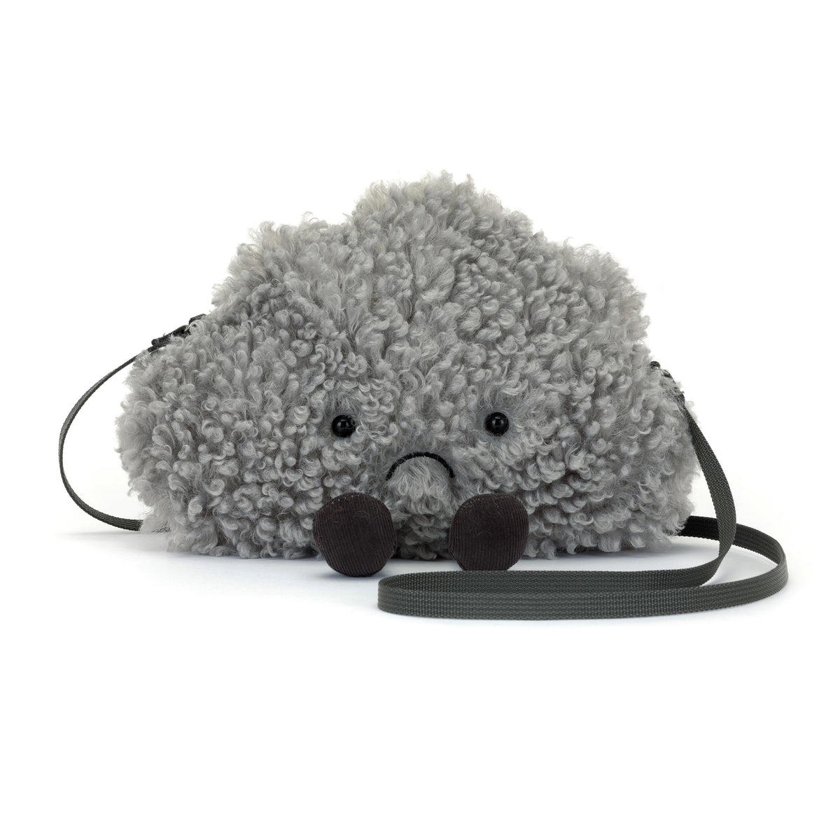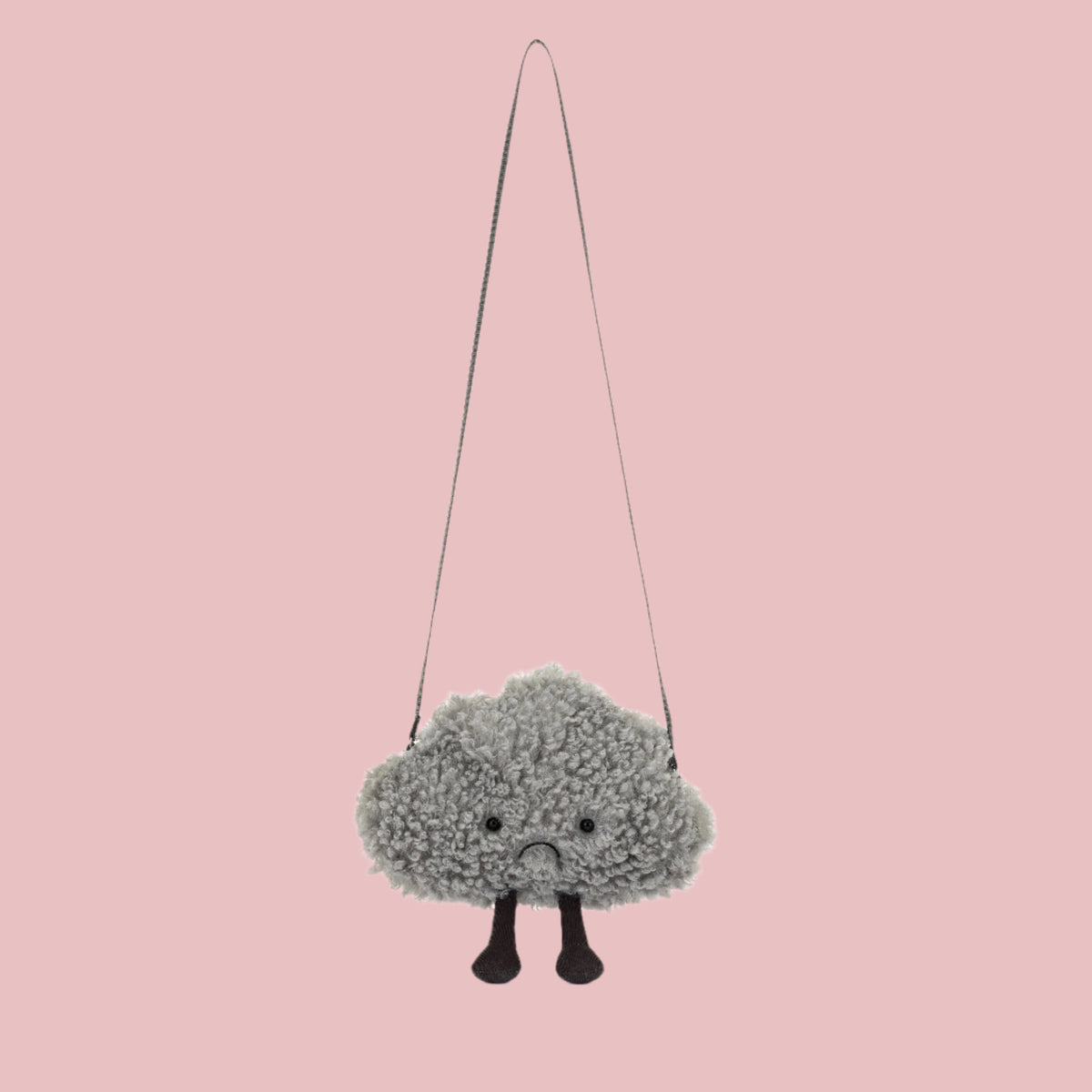 "Amuseables Storm Cloud Bag may look a little glum, but it is happy to keep your essentials safe in all weather. In textured grey fur with a stitched frown, this cloud has dark, fine cord boots, and can keep your essentials safe and hands free with a hidden zip closure and a long shoulder strap."