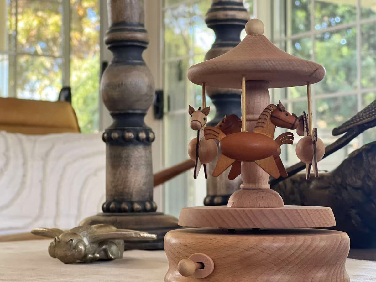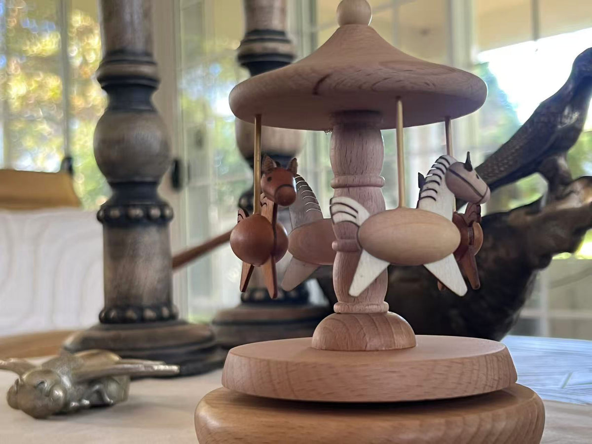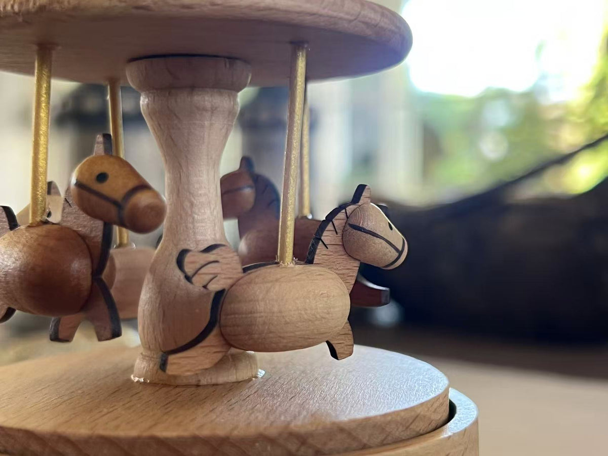This beautifully carved carousel features four wooden horses trotting in a peaceful circle beneath a smooth wooden canopy. The natural timber tones and minimalist details bring a calming, nostalgic feel to any space.