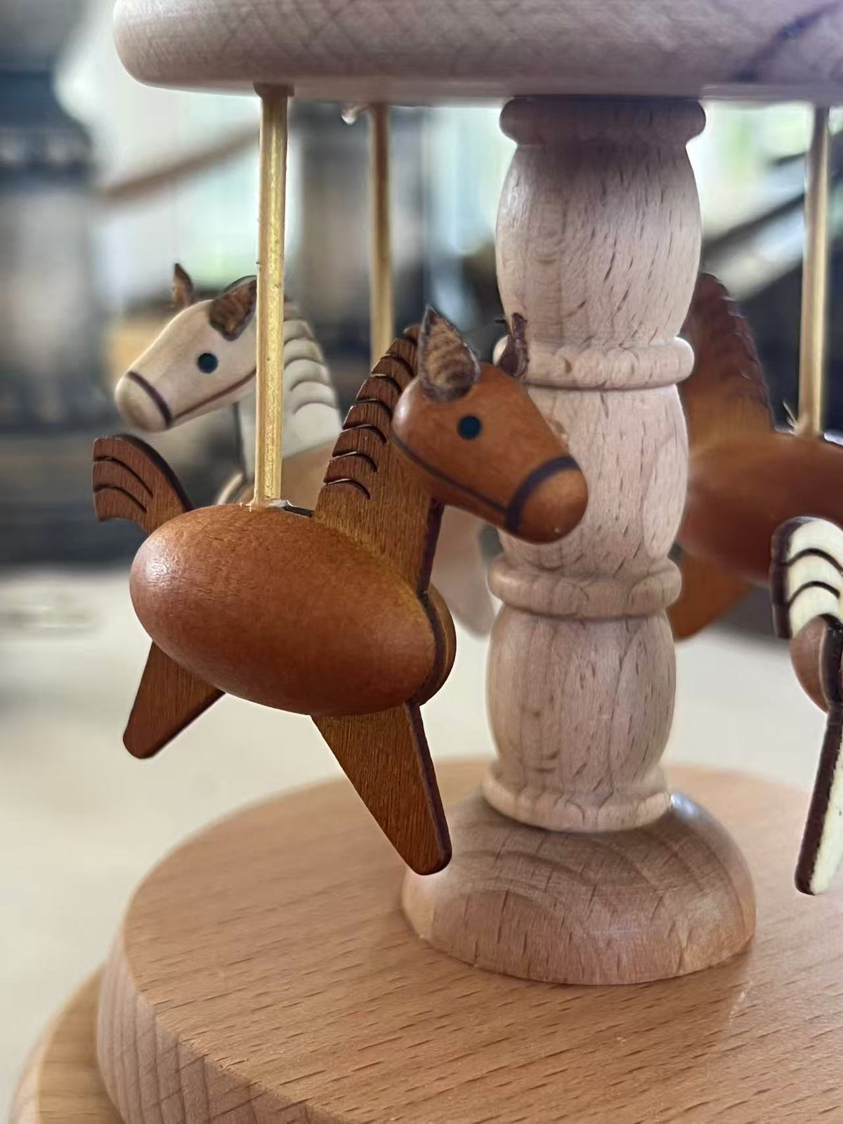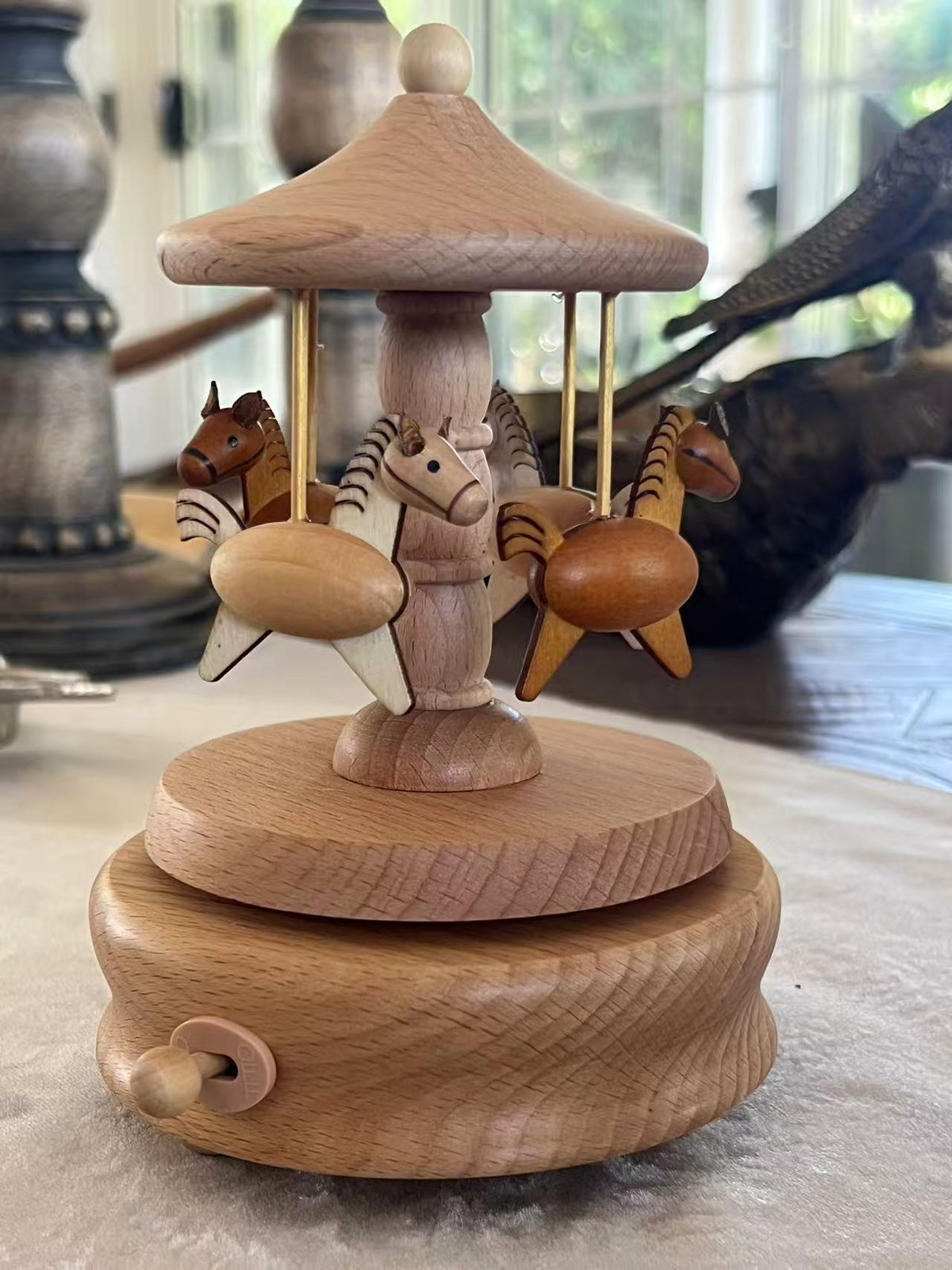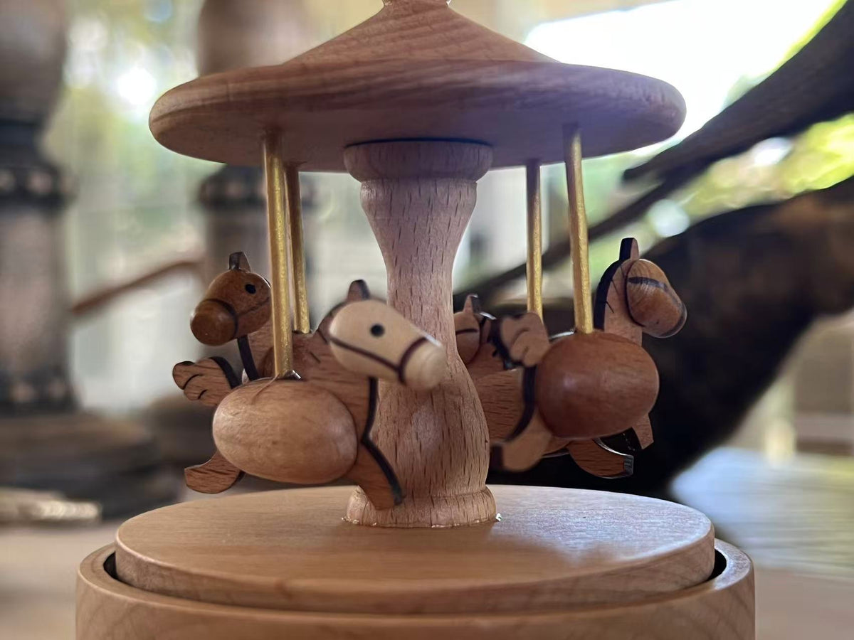 This beautifully carved carousel features four wooden horses trotting in a peaceful circle beneath a smooth wooden canopy. The natural timber tones and minimalist details bring a calming, nostalgic feel to any space.