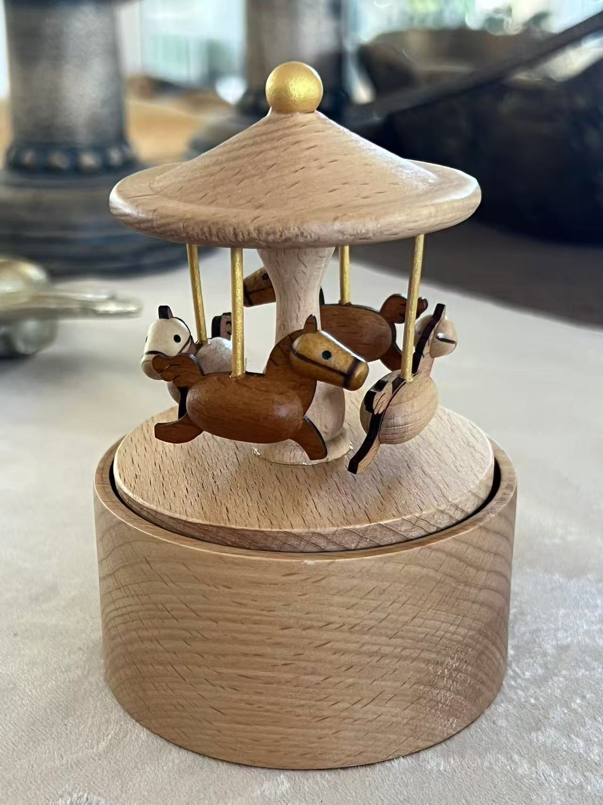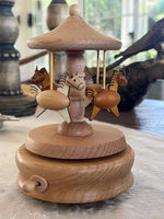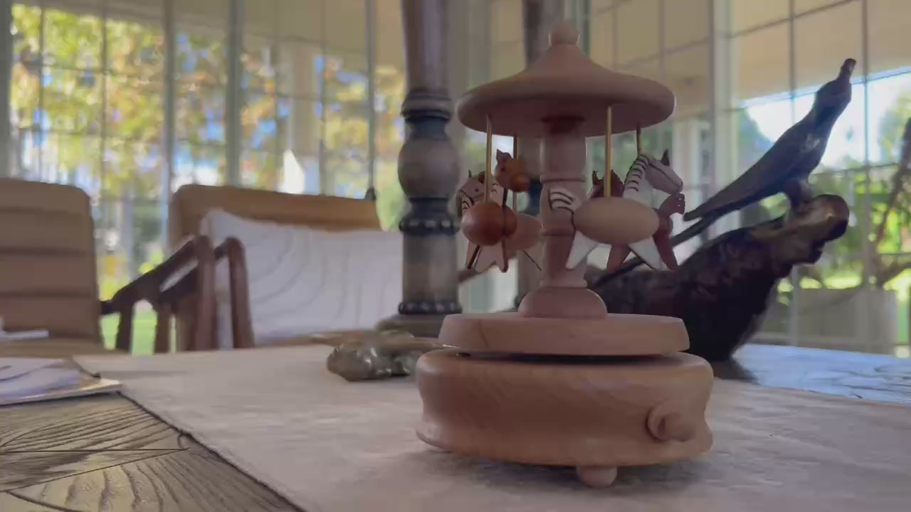 This petite carousel music box features four galloping wooden horses under a golden-tipped canopy, spinning slowly to a gentle melody. Its compact design makes it perfect for desks, shelves, or nightstands.