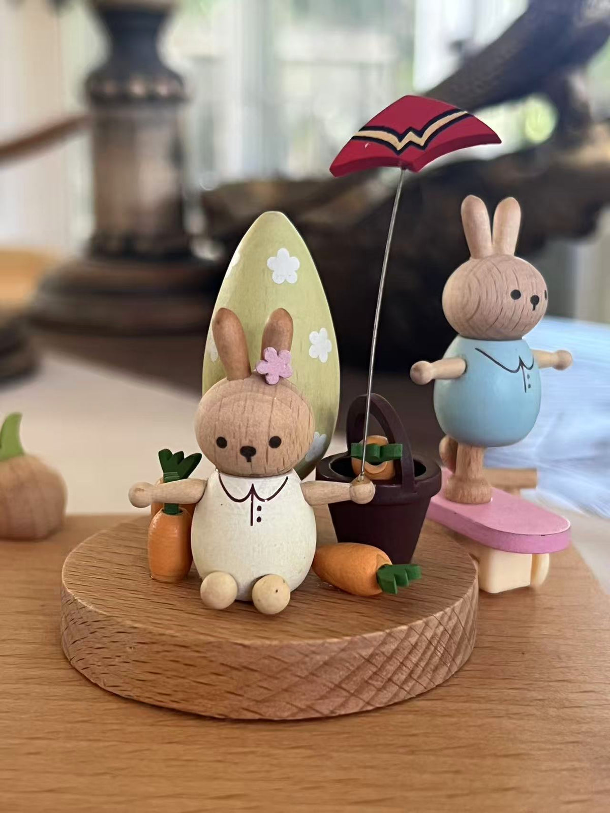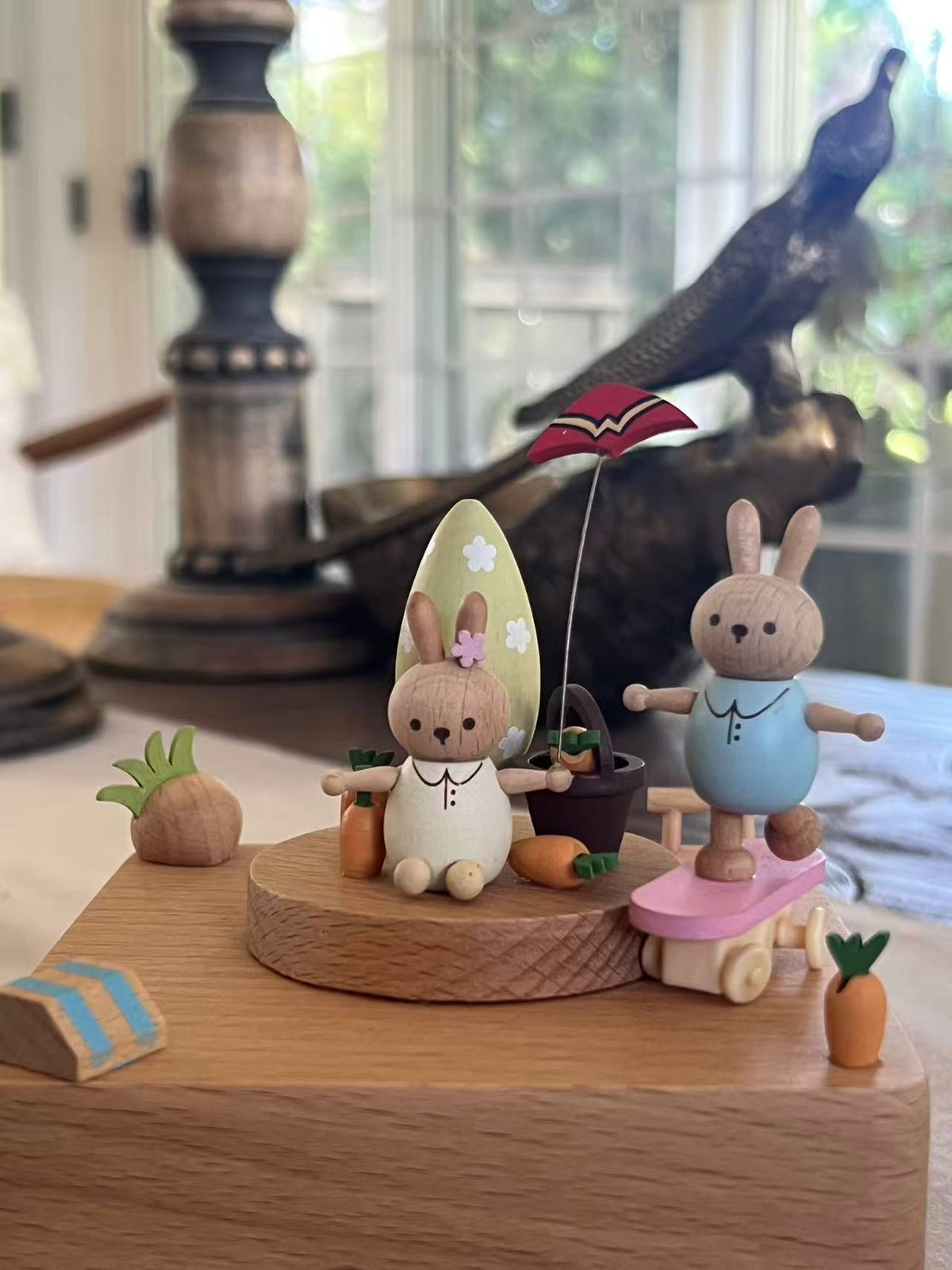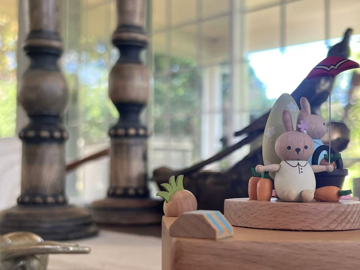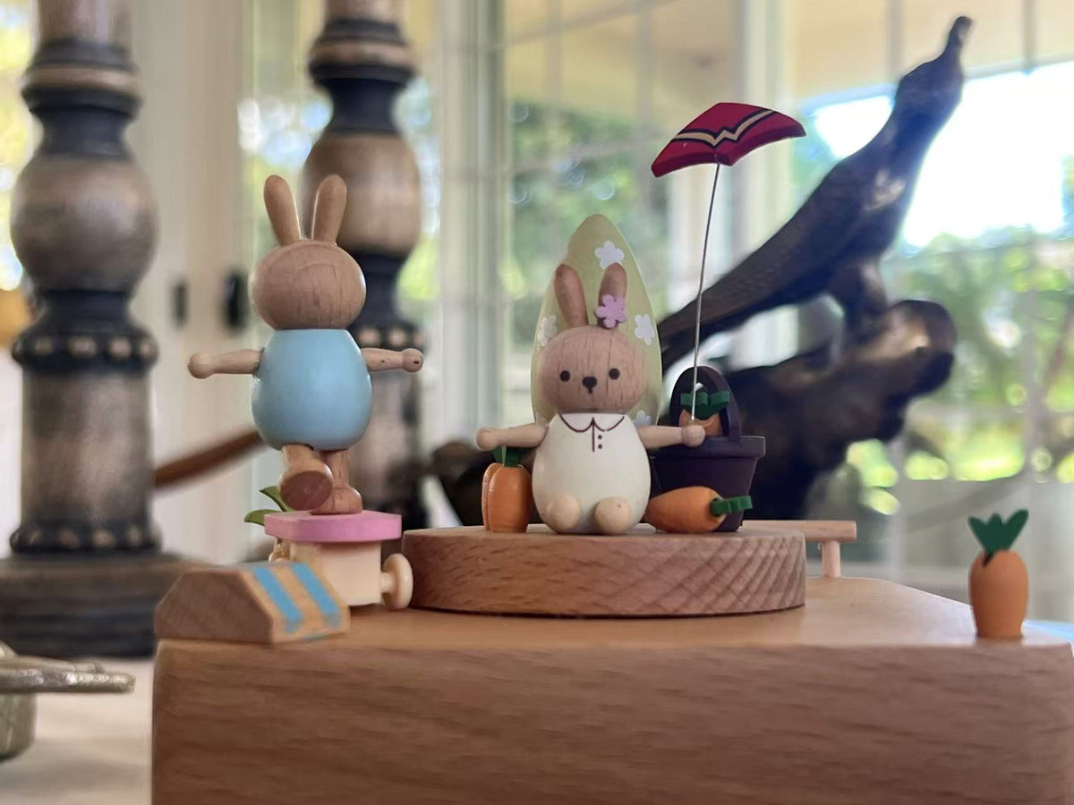 Handcrafted from solid timber, it’s powered by a classic wind-up mechanism—no batteries needed. The gentle motion and soft music make it a perfect gift for bunny lovers, little ones, or anyone who enjoys life's simple joys.