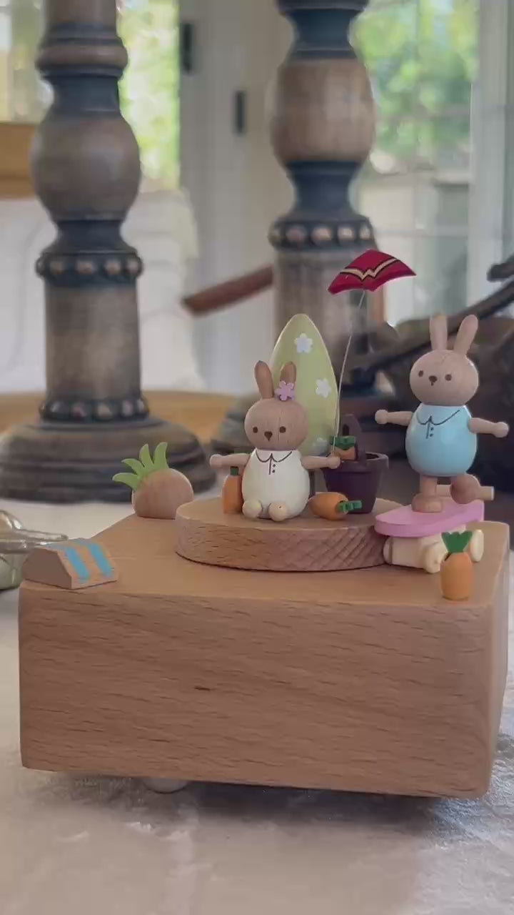 This charming music box captures a joyful springtime scene with two playful bunnies enjoying a sunny day outdoors. One bunny zips by on a tiny pink skateboard, while the other watches with a happy smile beneath a cheerful umbrella. With bright orange carrots, pastel details, and sweet park-day vibes, it's a delightful keepsake to celebrate love, friendship, or sibling bonds.