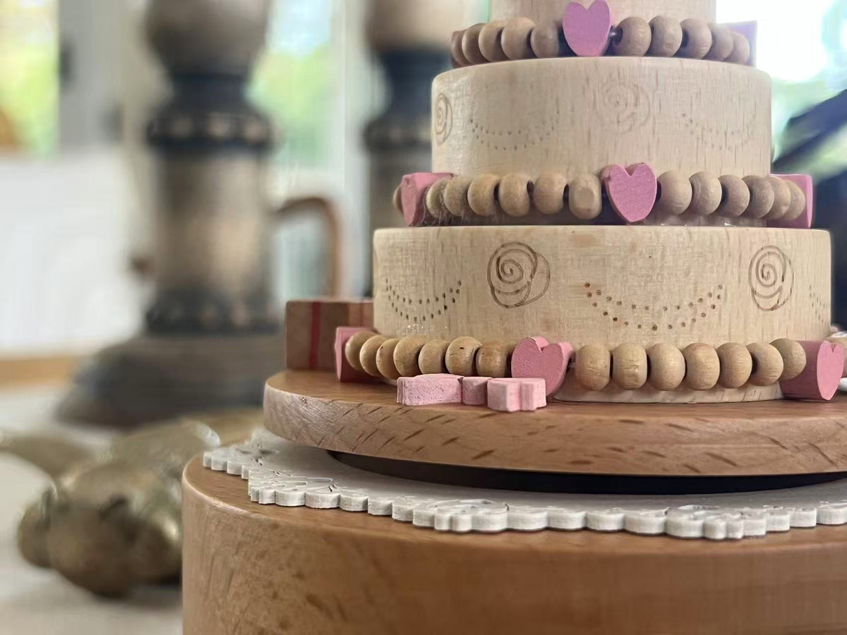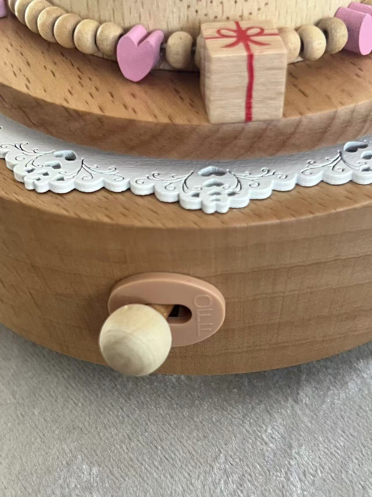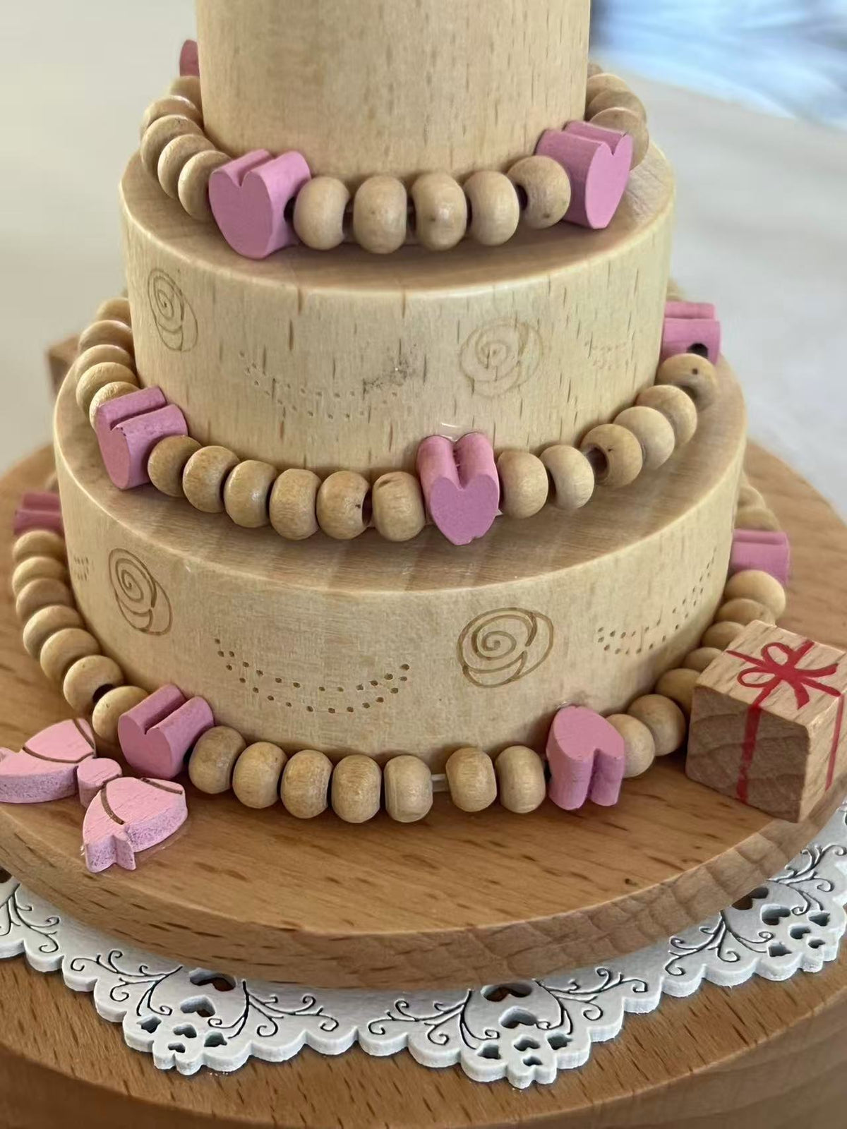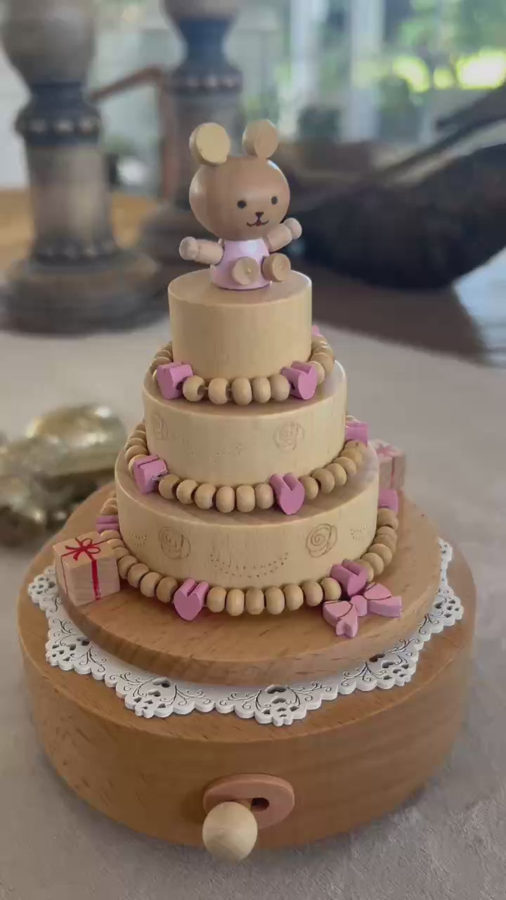 This charming music box features a three-tiered wooden cake adorned with heart beads, gift boxes, and a smiling teddy bear topper—all handcrafted with love and warmth.