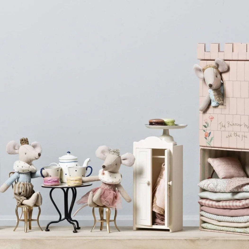 Maileg Mice tend to fit a 1:12 scale doll house well. Big Brother Mice are compatible with Maileg Micro and Mouse furniture.