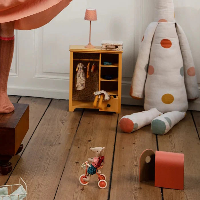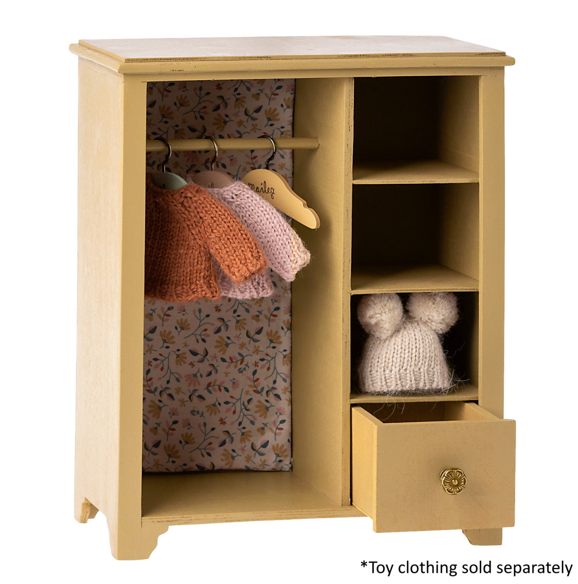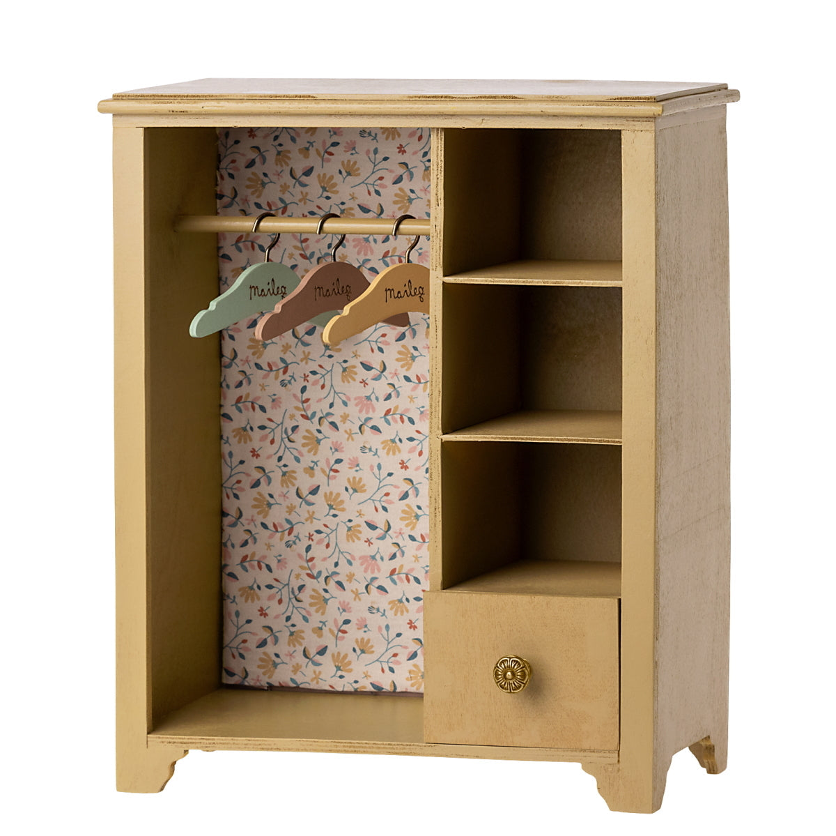 单价 每Your Maileg friends can use the Maileg Large Yellow Wardrobe to store their clothes and accessories. It includes three little hangers in different colors, and a beautiful Maileg fabric covers the back wall of the closet.